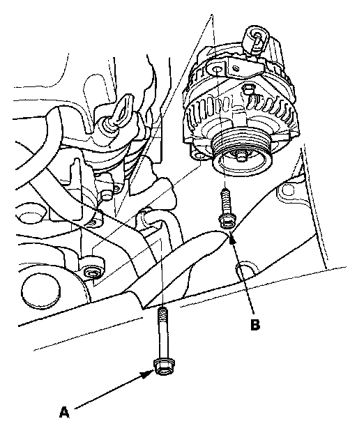 8. Remove the mounting bolt (A) and alternator bracket mounting bolt (B), then remove the alternator.