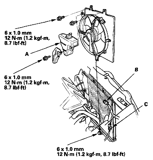3. Disconnect the A/C condenser fan motor connector (A) and the A/C compressor clutch connector (B), then remove the coolant reservoirs (C).