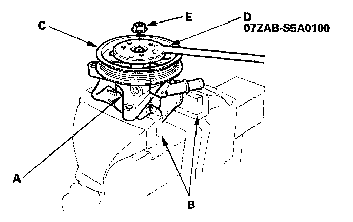 3. Hold the power steering pump (A) in a vise with soft jaws (B), then hold the pulley (C) with the special tool (D), and remove the pulley nut (E) and pulley. Be careful not to damage the pump housing with the jaws of the vise.