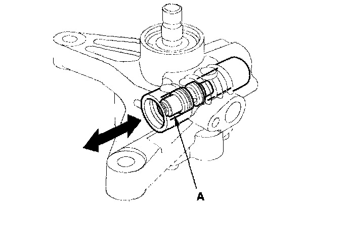 13. Slip the flow control valve back in the pump housing, and check that it moves in and out smoothly. If OK, go to step 14; if not, replace the pump as an assembly. The flow control valve (A) is not available separately.
