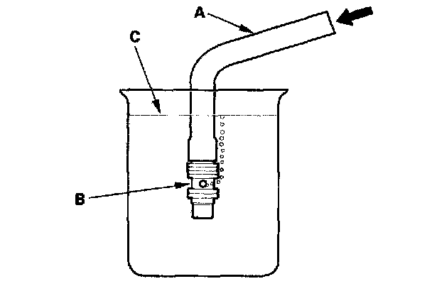 14. Attach a hose (A) to the end of the flow control valve (B) as shown. Then submerge the flow control valve in a container of power steering fluid or solvent (C), and blow in the hose.
