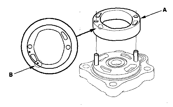22. Set the pump cam ring (A) over the two roll pins with its - mark (B) facing down.
