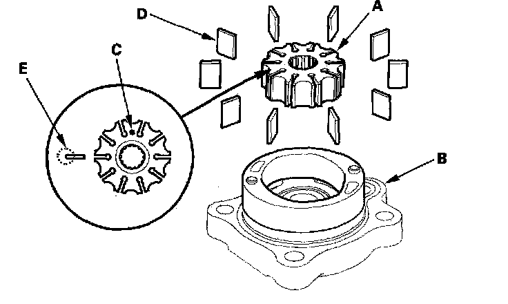 24. Set the 10 vanes (D) in the grooves in the rotor. Make sure that the round ends (E) of the vanes are in contact with the sliding surface of the cam ring.
