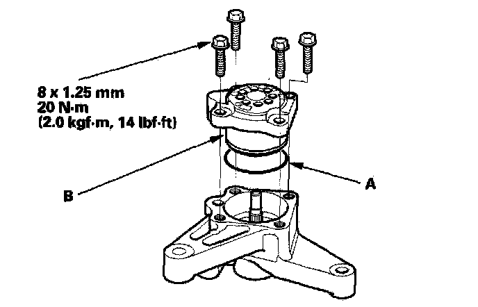 25. Coat the new 15.2 mm O-ring (A) with power steering fluid, and install it into the groove in the side plate (B).
