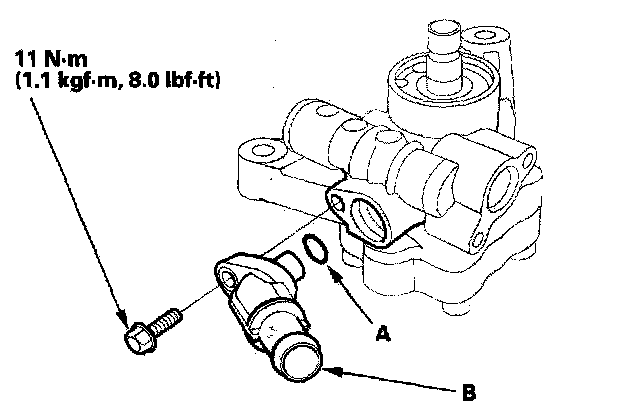 31. Coat the new 13 mm O-ring (A) with power steering fluid, and Install it on the inlet joint (B). Install the inlet joint on the pump housing.