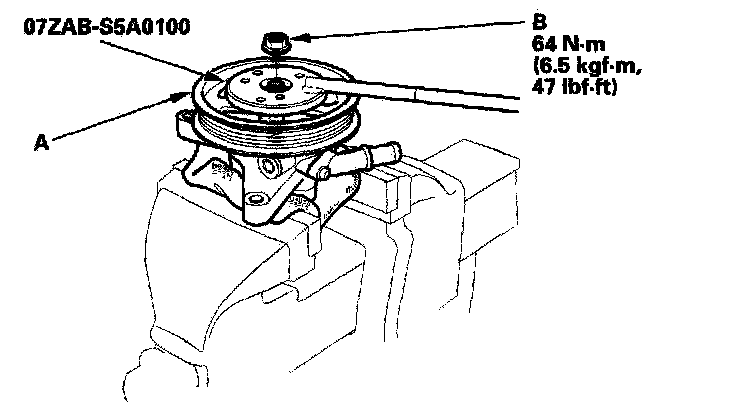 32. Install the pulley (A), then loosely install the pulley nut (B). Hold the steering pump in a vise with soft jaws. Be careful not to damage the pump housing with the jaws of the vise.