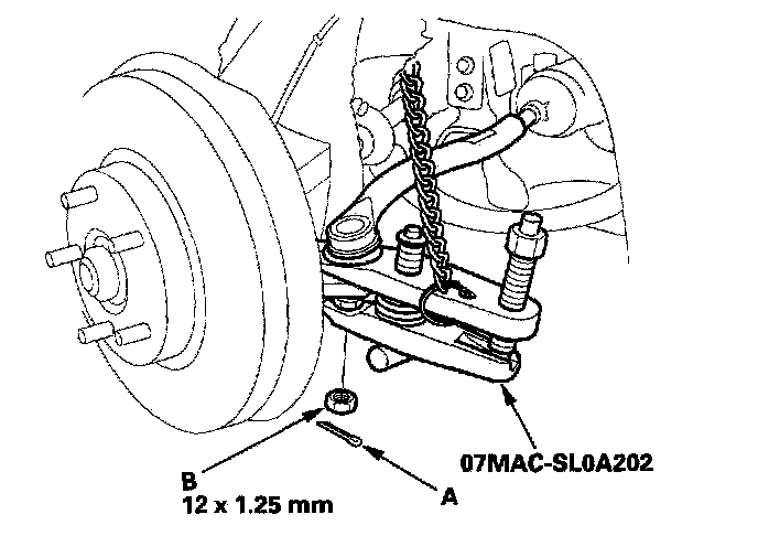 10. Remove and discard the coffer pin (A) from the tie-rod ball joint nut (B), and loosen the nut.