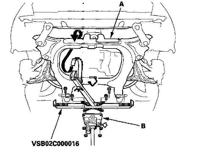20. Remove the front suspension subframe rear bracket (A) on the right and left of the vehicle from the front suspension subframe (B).