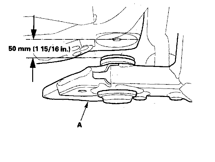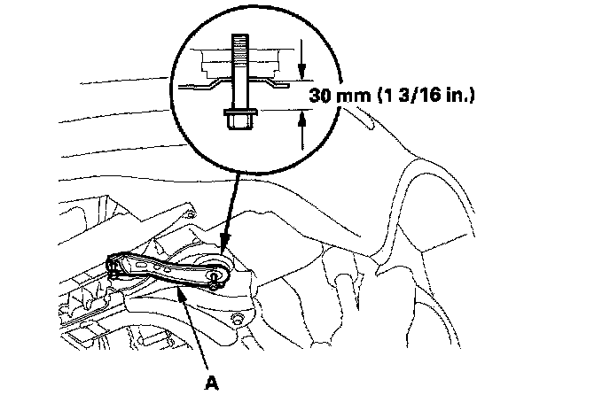 19. Loosen the front suspension subframe front bracket (A) mounting bolts on the right and left of the vehicle so they are about 30 mm (1 3/16 inch) from the mounting surface.