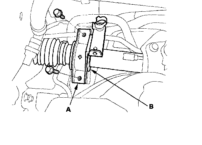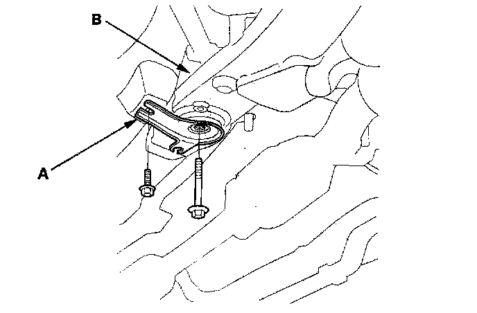 29. Remove the two flange bolts from the right side of the gearbox, then remove the gearbox mounting bracket (A) and cushion (B).