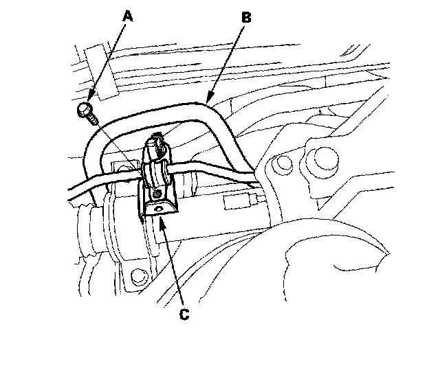 24. Remove the feed line holder mounting bolt (A) and return hose (B) from the gearbox mounting bracket (C).