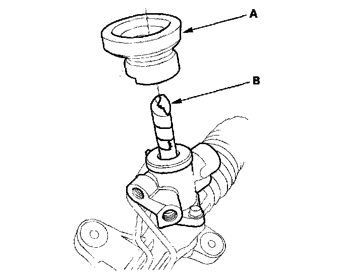 25. Place several shop towels under the line connections, and cover the gearbox mounting part to protect it from the power steering fluid. Loosen the flare nut (A), and disconnect the feed line (B).