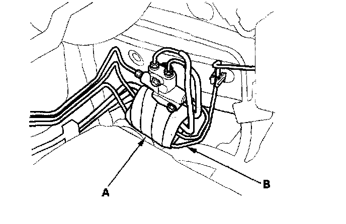 28. Remove and discard the steering gearbox mounting bolts (A) and washers (B) on the left gearbox mount.