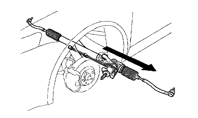 34. Carefully move the steering gearbox as an assembly toward the left side of the vehicle until the pinion shaft clears the wheelwell opening. Be careful not to damage the brake lines with the pinion shaft.