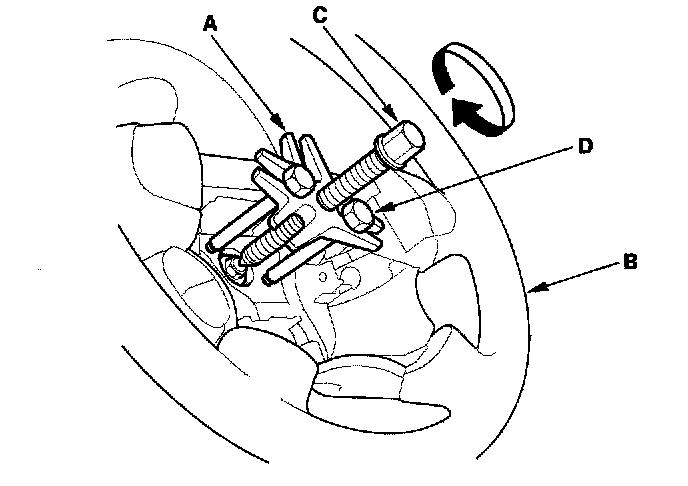 5. Install a commercially available steering wheel puller (A) on the steering wheel (B). Free the steering wheel from the steering column shaft by turning the pressure bolt (C) of the puller.