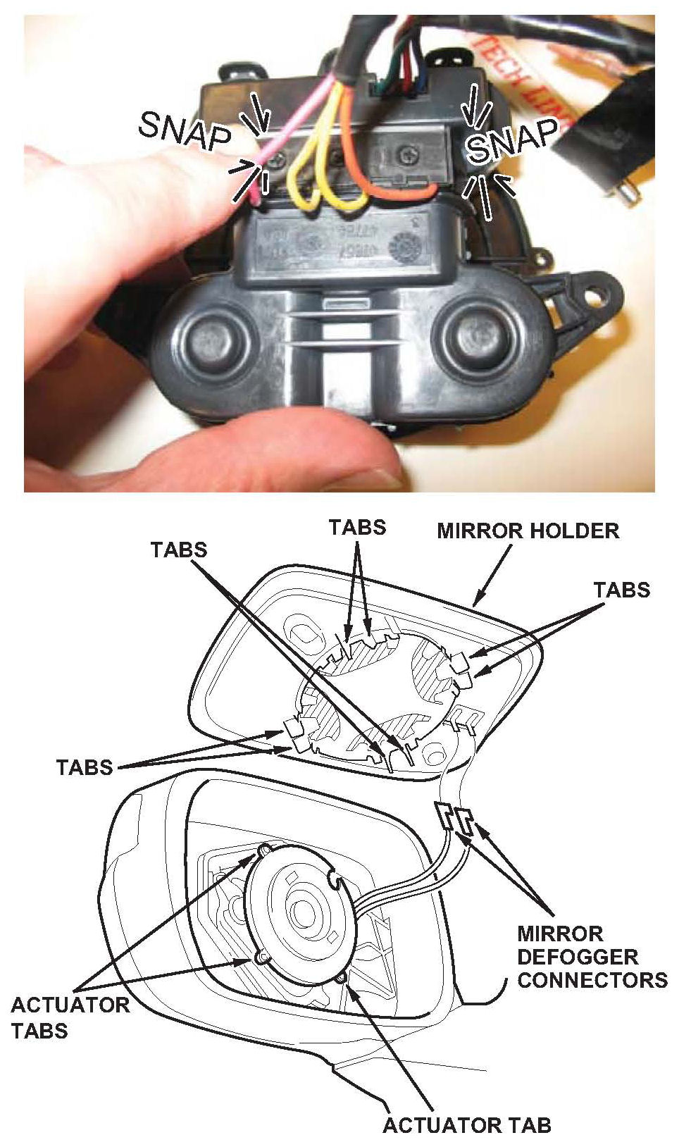 Use a small jeweler's screwdriver to release the two tabs on either side of the long rectangular connector. Lift the connector straight off the mirror actuator. Be careful not to bend the pins during removal, as they can be easily damaged.