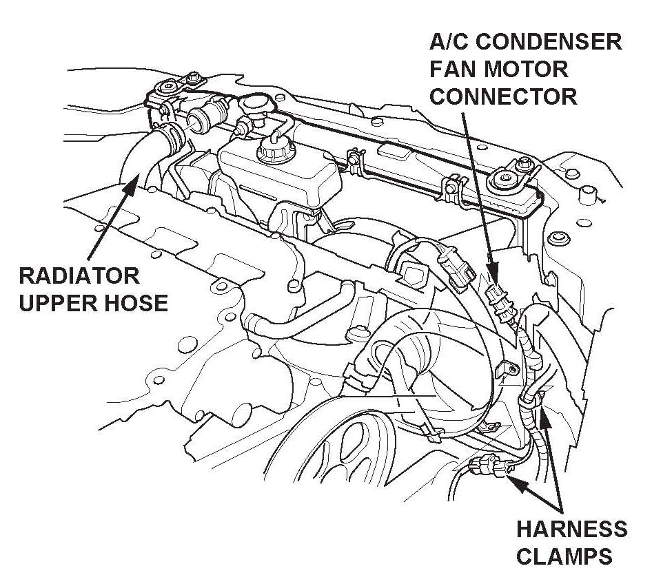 16. Reconnect the A/C condenser fan motor connector, the harness clamps, and the upper radiator hose.