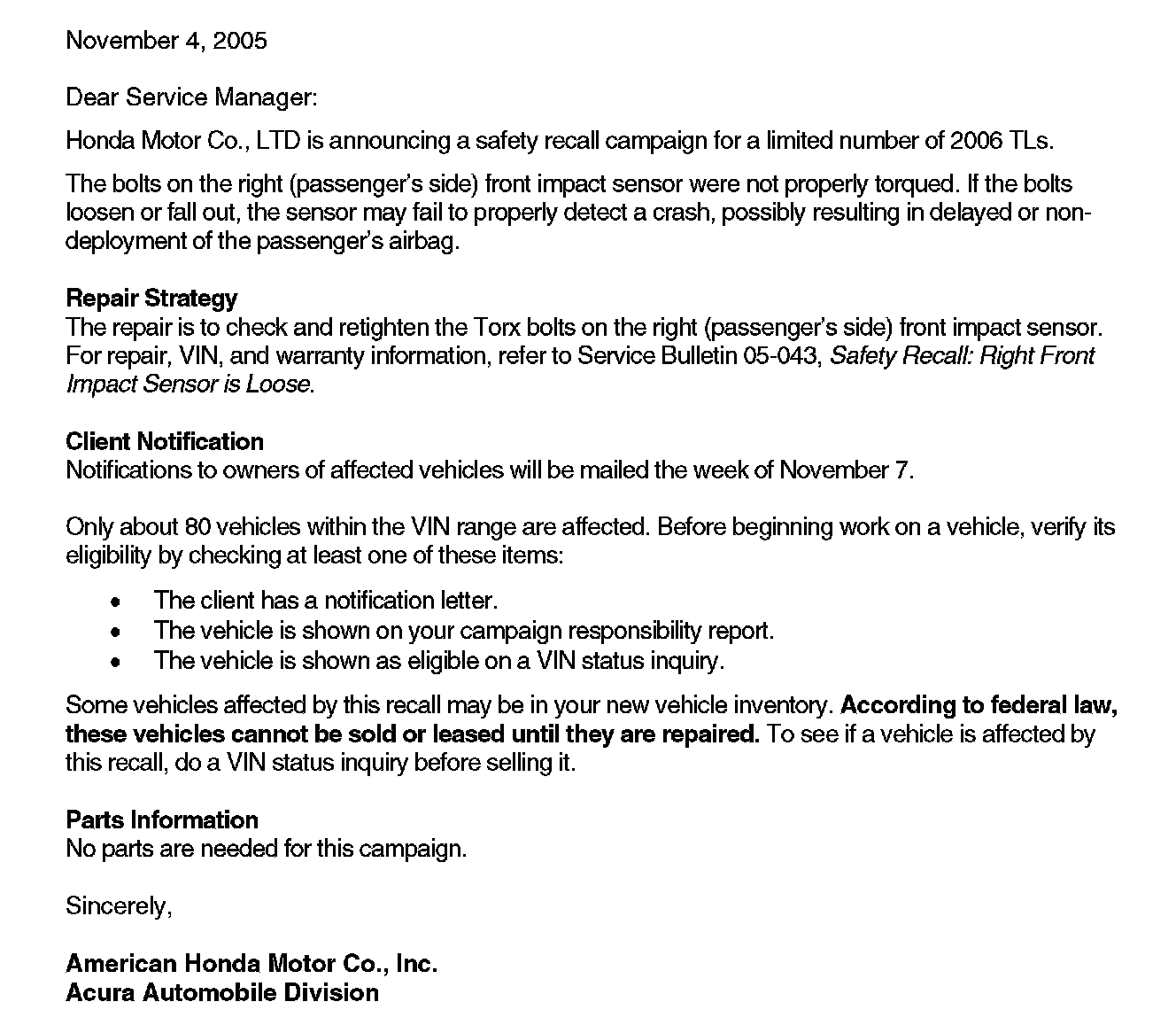 Some vehicles affected by this campaign may be in your new vehicle inventory. According to federal law, these vehicles cannot be sold or leased until they are repaired. To see if a vehicle is affected by this campaign, do a VIN status inquiry before selling it.