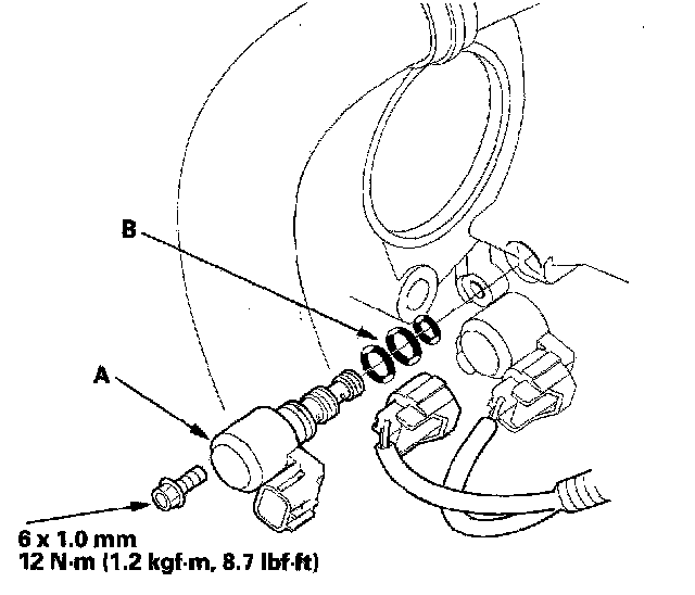 10. Install a new shift solenoid valve A with new O-rings (B). While installing the solenoid valve, do not allow dust or other foreign particles to enter the transmission.