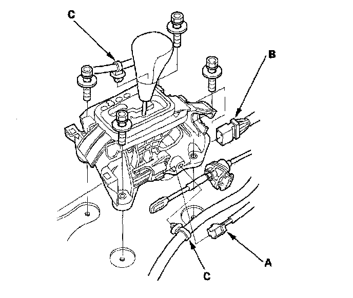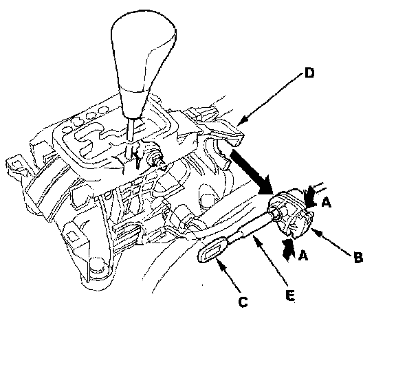 4. Press the holder lock release (A), and pull out the socket holder (B) to remove the shift cable (C) from the shift lever bracket base (D). Do not remove the shift cable by pulling on the shift cable guide (E).