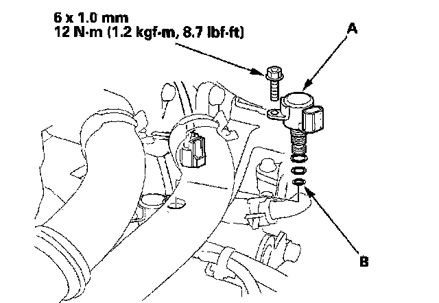 3. Install a new torque converter clutch solenoid valve with new O-rings (B). While installing the solenoid valve, do not allow dust or other foreign particles to enter the transmission.