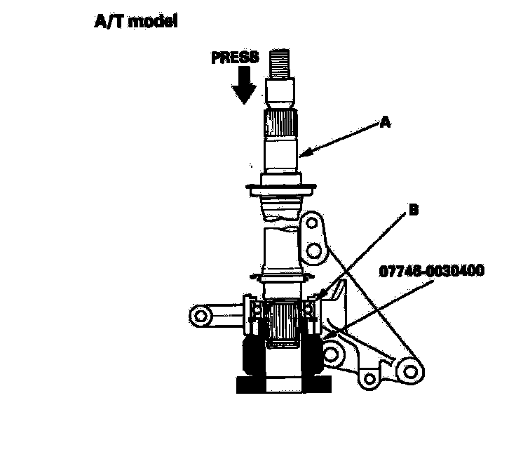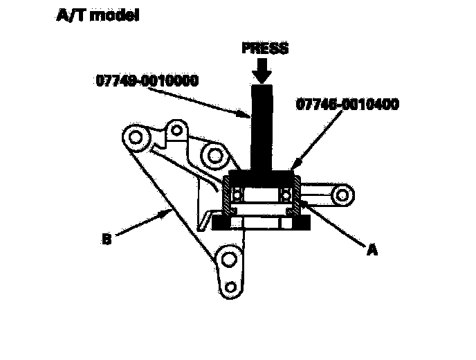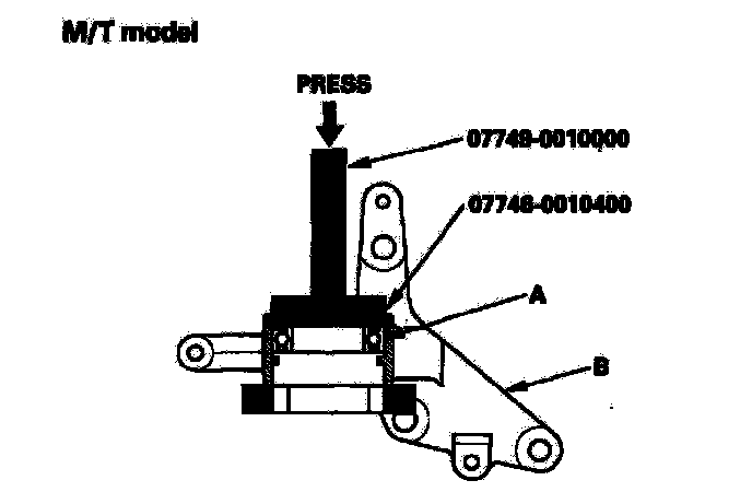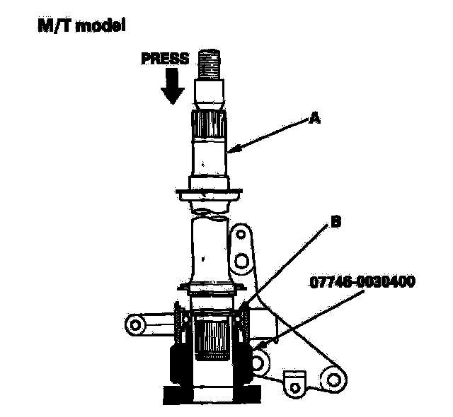 4. Press the intermediate shaft (A) into the shaft bearing (B) using the special tool and a press.