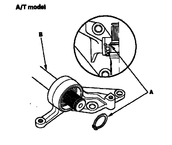 5. Install, then seat the external snap ring (A) into the groove of the intermediate shaft (B).