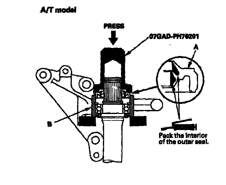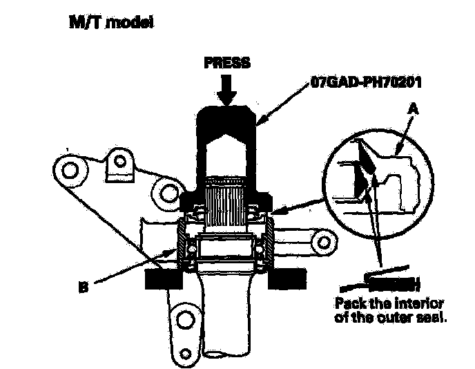 6. Install the outer seal (A) into the bearing support (B) using the special tool and a press.