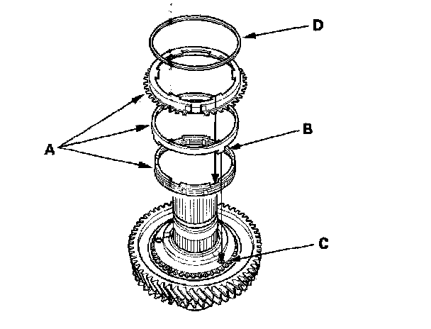 3. Install the triple cone synchro assembly (A) by aligning the synchro cone fingers (B) with the holes in 1st gear (C), then install the synchro spring (D).