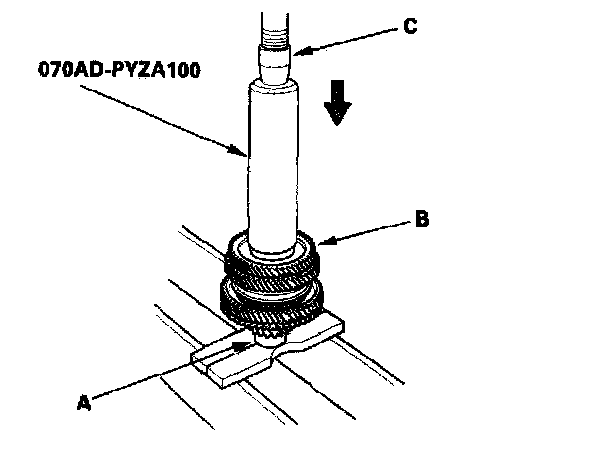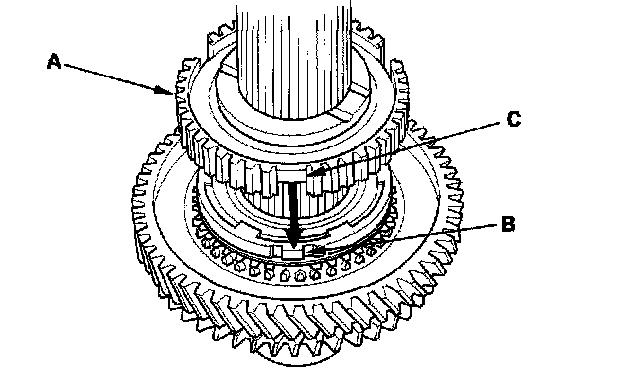 4. Install the 1st/2nd synchro hub (A) by aligning the outer synchro ring fingers (B) with the grooves in the 1st/2nd synchro hub (C).