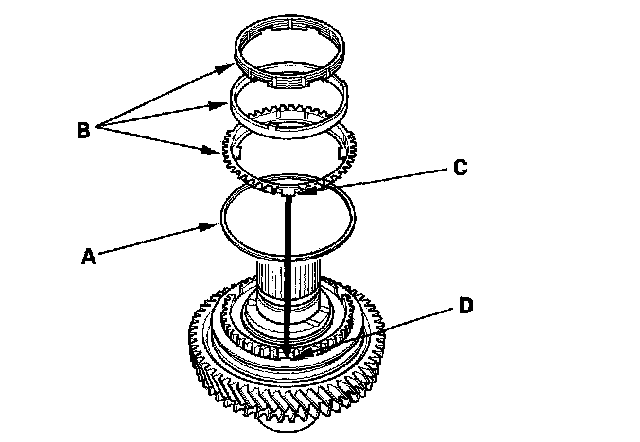 7. Install the triple cone synchro assembly (B) by aligning the outer synchro ring fingers (C) with the grooves in the 1st/2nd synchro hub (D).