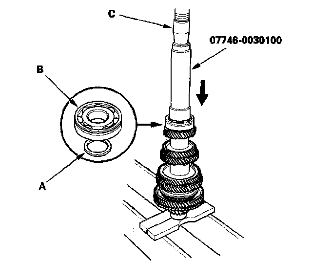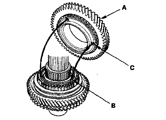 9. Install 2nd gear (A) by aligning the synchro cone fingers (B) with the holes in 2nd gear (C).