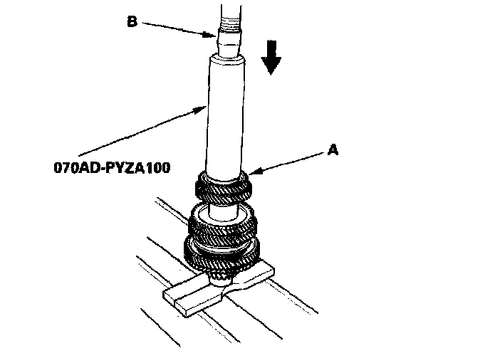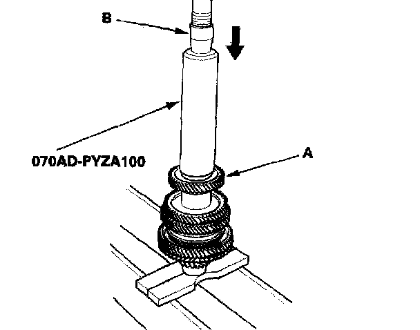 10. Support the countershaft (A) on the steel blocks, then install 3rd gear (B) using the special tool and a press (C).