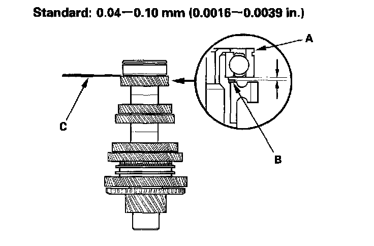 15. Measure the clearance between the old bearing (A) and the 35 mm shim (B) with a feeler gauge (C).