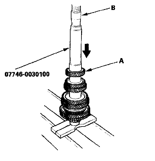 2. Install the countershaft reverse gear (A), needle bearing (B), and 1st gear (C) onto the countershaft (D).