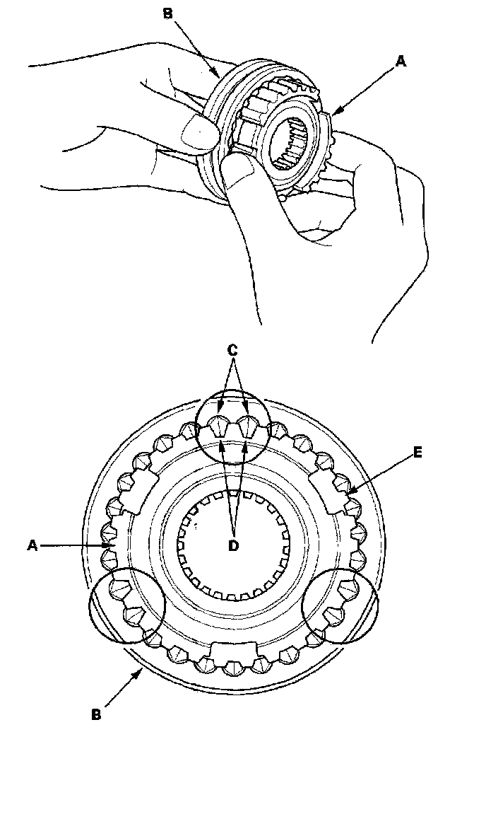 2. Install each synchro hub (A) in its mating synchro sleeve (B), and check for free movement. Make sure you match the three sets of longer teeth (C) (120 degrees apart) on the synchro sleeve with the three sets of deeper grooves (D) in the synchro hub. Do not install the synchro sleeve with its longer teeth in the synchro hub slots (E) because it will damage the spring ring.