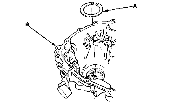 1. Remove the 82 mm shim (A) from the transmission housing (B).