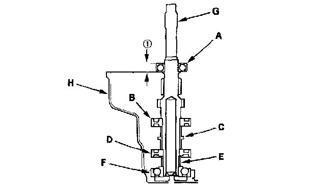 2. Install the ball bearing (A), 3rd/4th synchro hub (B), 4th/5th gear distance collar (C), 5th/6th synchro hub (D), distance collar (E), and angular ball bearing (F) on the mainshaft (G), then install the assembled mainshaft in the transmission housing (H).