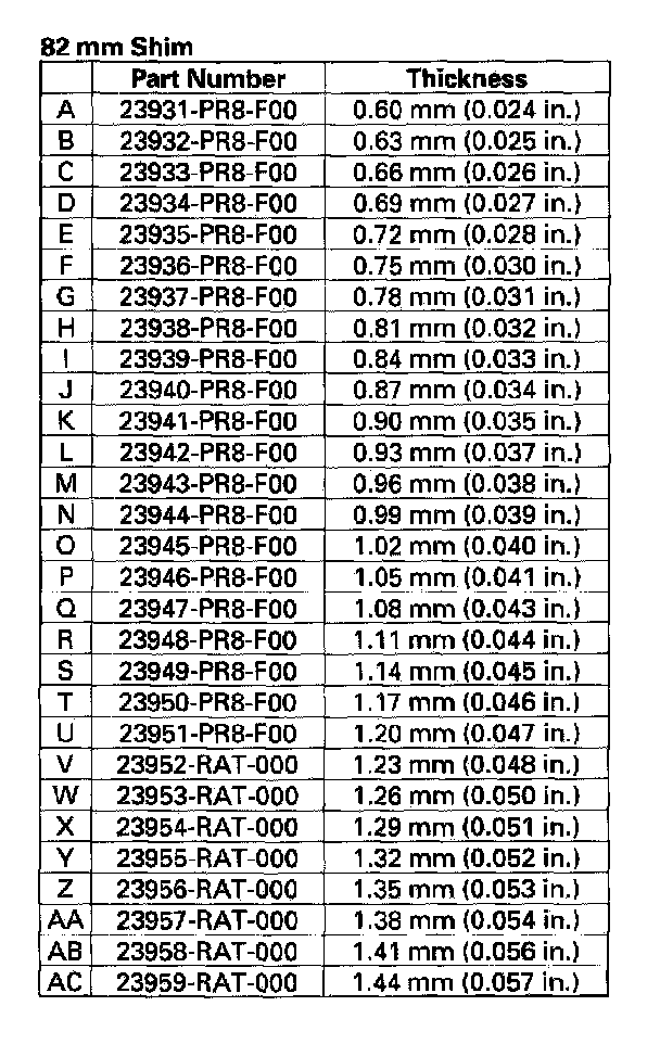 5. Select the proper 82 mm shim from the chart. Follow the example below, and use the measurements you made in steps 3 and 4.