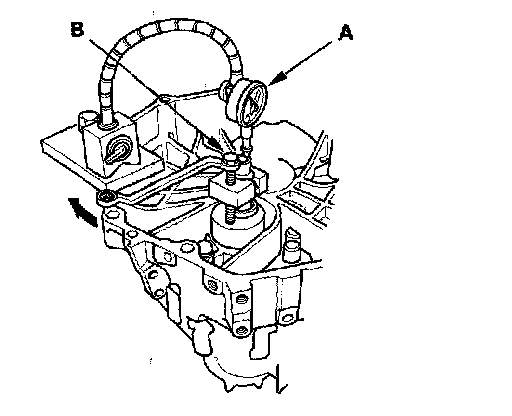 16. Turn the mainshaft holder bolt (B) clockwise; stop turning when the dial gauge has reached its maximum movement. The reading on the dial gauge is the amount of mainshaft end play. Do not turn the mainshaft holder bolt more than 60 degrees after the needle of the dial gauge stops moving. Applying more pressure with the mainshaft holder bolt may damage the transmission.
