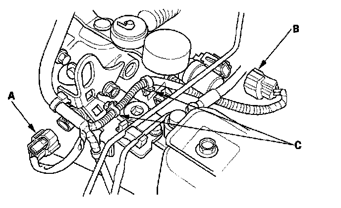 12. Disconnect the back-up light switch connector (A) and reverse lockout solenoid connector (B), then remove the harness clips (C).