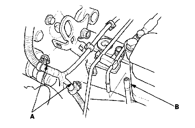 14. Remove the harness clips (A), then disconnect the vacuum hose (B).