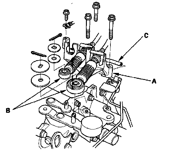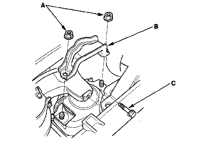 20. Remove the front engine mount mounting nuts (A), front engine mount stop (B), and the front engine mount mounting bolt (C).