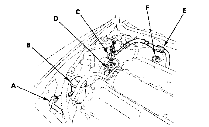 23. Remove the power steering pump outlet line (C) from the Power steering pump (D), and remove the hose (E) from its clamp (F).
