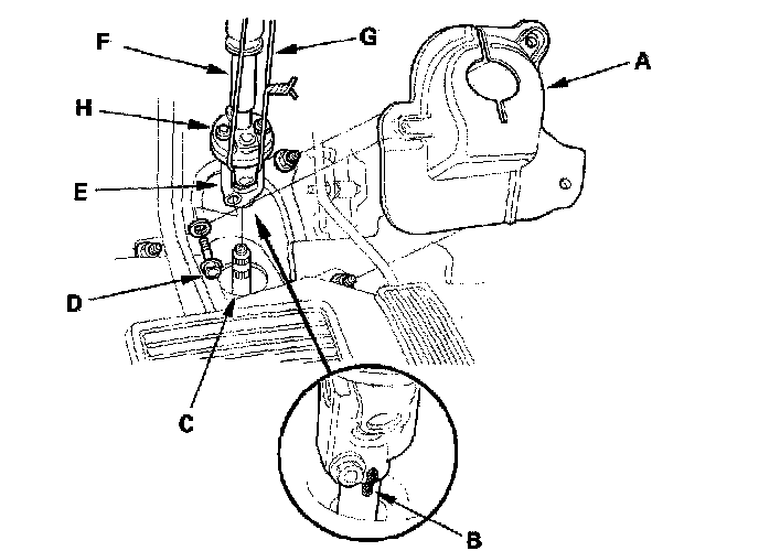 26. Make a reference mark (B) across the steering joint and steering gearbox pinion shaft (C). Remove the steering joint bolt (D), and disconnect the steering joint (E) by removing the steering joint toward the steering column. Hold the slider shaft (F) on the column with a piece of wire (G) between the joint yoke (H) on the slider shaft to the joint yoke on the upper shaft.