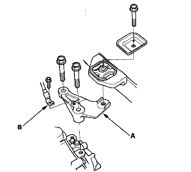 27. Remove the transmission mount bracket (A) and ground cable (B).