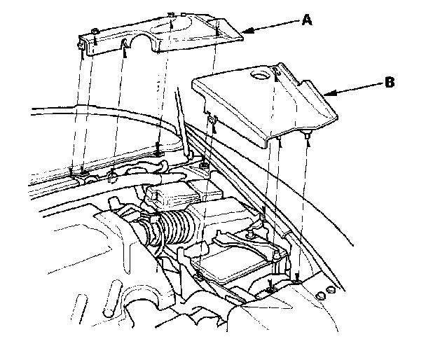 1. Remove the left rear engine compartment cover (A) and the left side engine compartment cover (B).