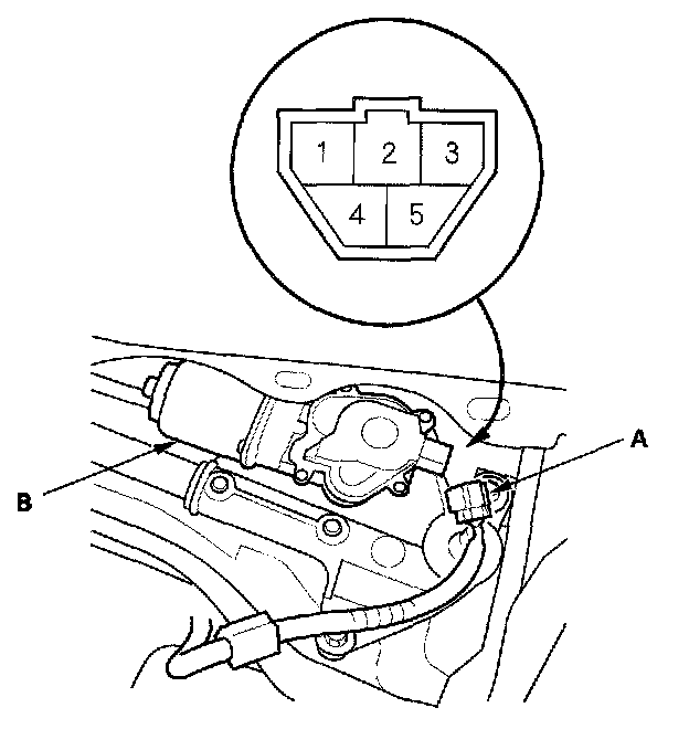 3. Disconnect the 5P connector (A) from the wiper motor (B).