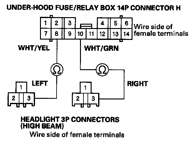 11. Check for continuity between the No. 3 terminal of the headlight (high beam) 3P connectors and the No. 8 (left headlight) or No. 10 (right headlight) terminals of the under-hood fuse/relay box 14P connector H.