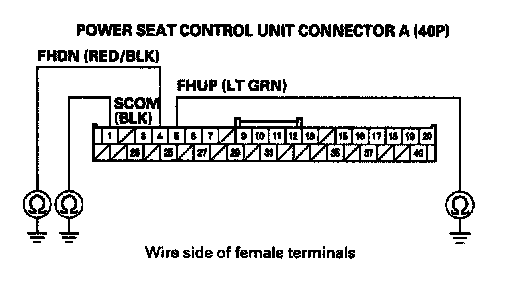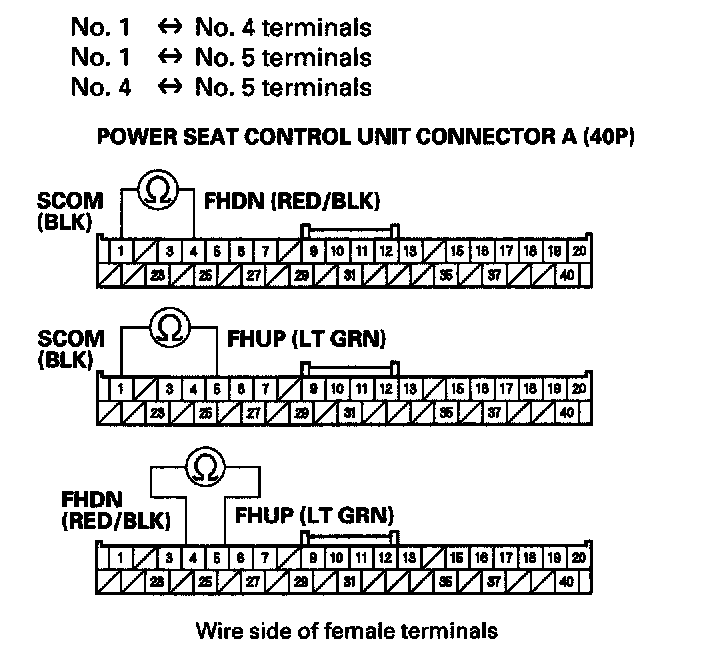 9. Check for continuity between the following terminals of the power seat control unit connector A (40P).